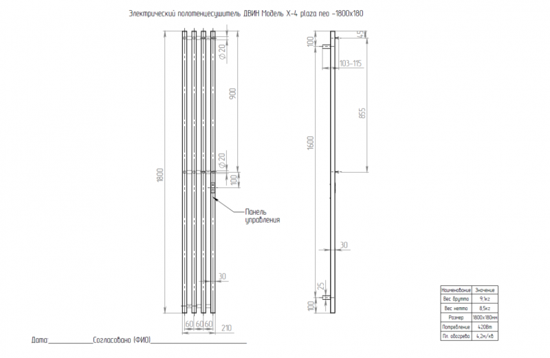 Полотенцесушитель ДВИН X-4 plaza neo 140/18 Электрический (диммер (квадрат) Графит) ДВИН